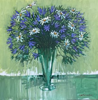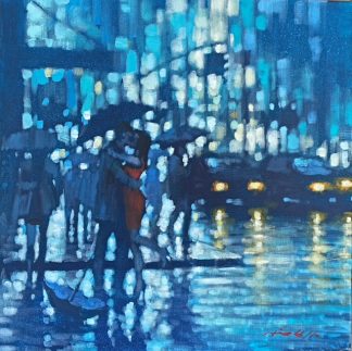 Working principally in Acrylic on canvas, the focus of Hinchliffe’s work is recording the light, shapes and movement of city streets.
