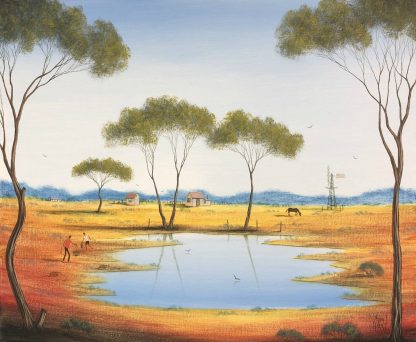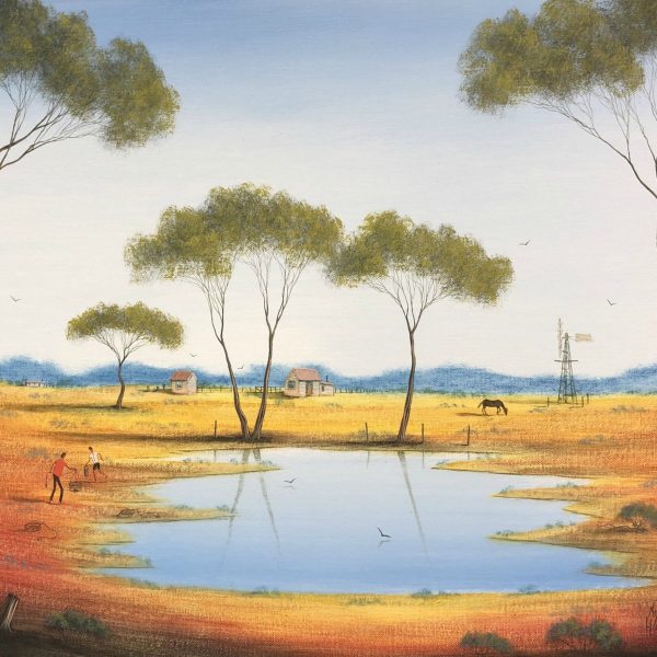 A son of Pro Hart, Kym was blessed with many opportunities to study under different teaches & artists, developing his individual style and techniques. Many of Kym’s outback artworks are narratives. Not only do they depict a particular scene but they draw the viewer in to witness a particular lifestyle. Distinctively naïve, the artist’s style has resulted in his works becoming popular and forming part of a number of private collections within Australia and overseas. Although predominantly working in oils, the range of mediums adopted by Kym include gouache, watercolors, etching, monotypes and block printing