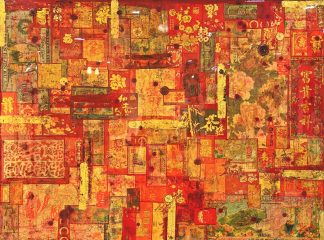 Paintings in Vario’s “Wealth” series with background Chinese motifs were inspired by a trip to Shanghai. The background is composed of papers collected on her adventures, later going through an extensive acid-free process to make them PH neutral. Colours are then enhanced or changed using watercolour paints and overlaid with acrylic paint, gold leaf, ink and antiquing. Here again they are finished off with her trademark glass-like finish.