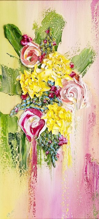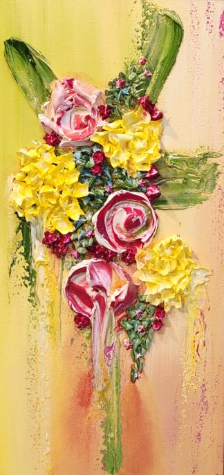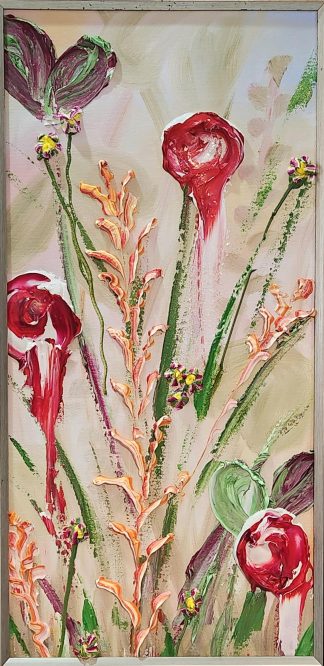 In much of her work, Vario orchestrates a combination of mediums layered to create high-relief tactile finishes with three-dimensional impact. She is constantly stretching her chosen medium (acrylic) to its full potential. In these artworks, chromatism is the artist’s chosen tool for constructing images, where the artist’s bright and vivid colours are reflective of her links to the seductive Australian landscape.