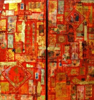 Paintings in Vario’s “Wealth” series with background Chinese motifs were inspired by a trip to Shanghai. The background is composed of papers collected on her adventures, later going through an extensive acid-free process to make them PH neutral. Colours are then enhanced or changed using watercolour paints and overlaid with acrylic paint, gold leaf, ink and antiquing. Here again they are finished off with her trademark glass-like finish.