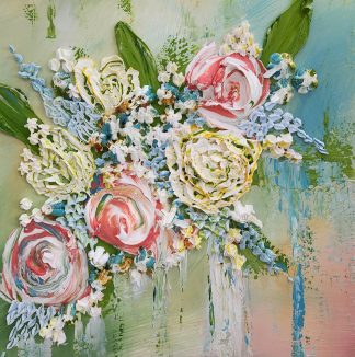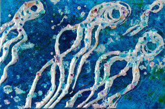 In much of her work, Vario orchestrates a combination of mediums layered to create high-relief tactile finishes with three-dimensional impact. She is constantly stretching her chosen medium (acrylic) to its full potential. In these artworks, chromatism is the artist’s chosen tool for constructing images, where the artist’s bright and vivid colours are reflective of her links to the seductive Australian landscape.