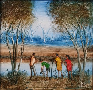Pro Hart’s paintings depict the vastness of the outback with its harsh yet beautiful landscape and sheep stations from where he grew up. Pro loved to find comedy in outback events such as the country Race Meetings and the huge family picnics in the dried up creek beds. His quirky insect series became famous when millions saw the cleaning lady on television throwing up her hands and saying ‘Oh Mr Hart, what a mess!’ after Pro had turned the Du Pont carpet into a canvas and transformed the food mess into a gorgeous dragonfly.