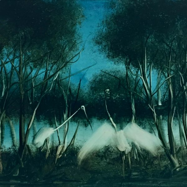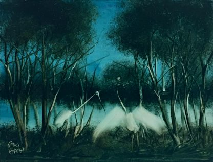 A particularly fine painting from the Water Birds series. Generally crafted in cool colours, a strong sense of poetry arises in these works. Showing deft technical skill often associated with oriental styles, here the work of Pro Hart takes a distinctive turn. The mystery behind the artist’s motivation is reflected in the beauty of nature, with its long-legged birdlife dancing gracefully in the dappled shallows of a cool billabong.