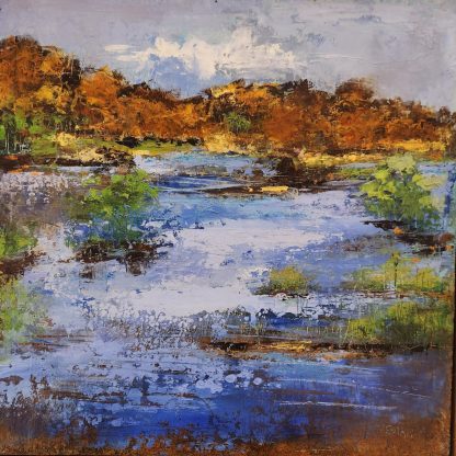 Barrett’s abstract paintings explore the emotional consequences of life, evolving intuitively as a result of day-to-day occurrences. Layers of rich glazes, bold strokes, symbols and marks, collage, texture and colour are essential elements. Layering colour and texture continuously throughout the painting process she draws the viewer into a landscape perhaps once seen or felt.