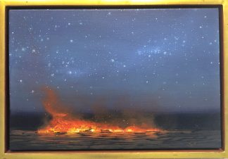 Some of Storrier’s most famous artworks are his evocative depictions of the Australian landscape in his iconic Lines of Fire and subsequent Burning Log series. Inspired by the destruction and decay of material culture and the beauty and harshness of the outback, these paintings highlight the power and vitality of fire as a force of nature. Creating string-lines of fire hung horizontally within desolate surrounds, he showcases the flames as a source of beauty, power and destruction, their warm and vibrant colours complementing a starry evening sky.